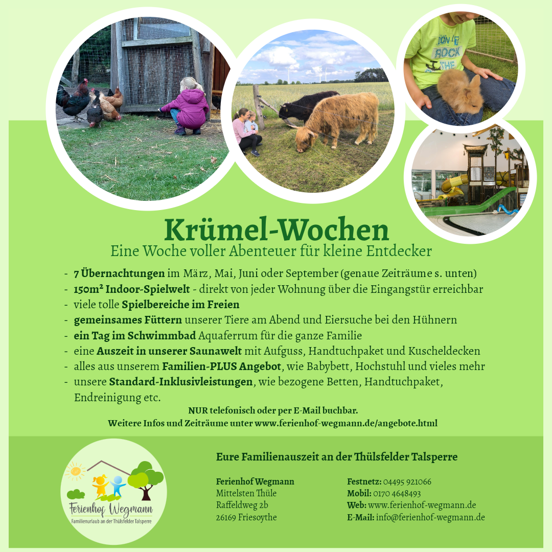 Krümel-Wochen (Nebensaison - nur telefonisch oder per E-Mail buchbar)